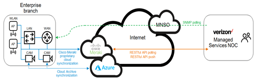 Here’s a graphic showing Verizon’s Management Architecture providing full integration with Cisco Meraki’s cloud-based architectures and devices that are managed directly through Verizon’s network management architecture: