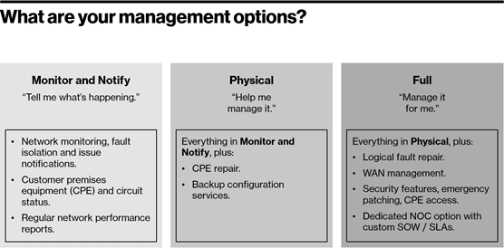 Three service levels are available with the Managed LAN service: Monitor & Notify, Physical Management, and Full Management.