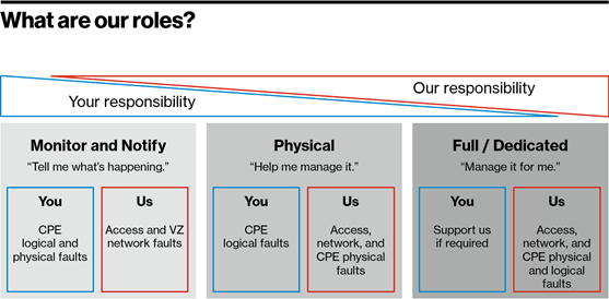 As noted above, Verizon will electronically notify you about fault conditions. Final responsibility for clearing faults depends on the Managed LAN service level and the nature of the fault.