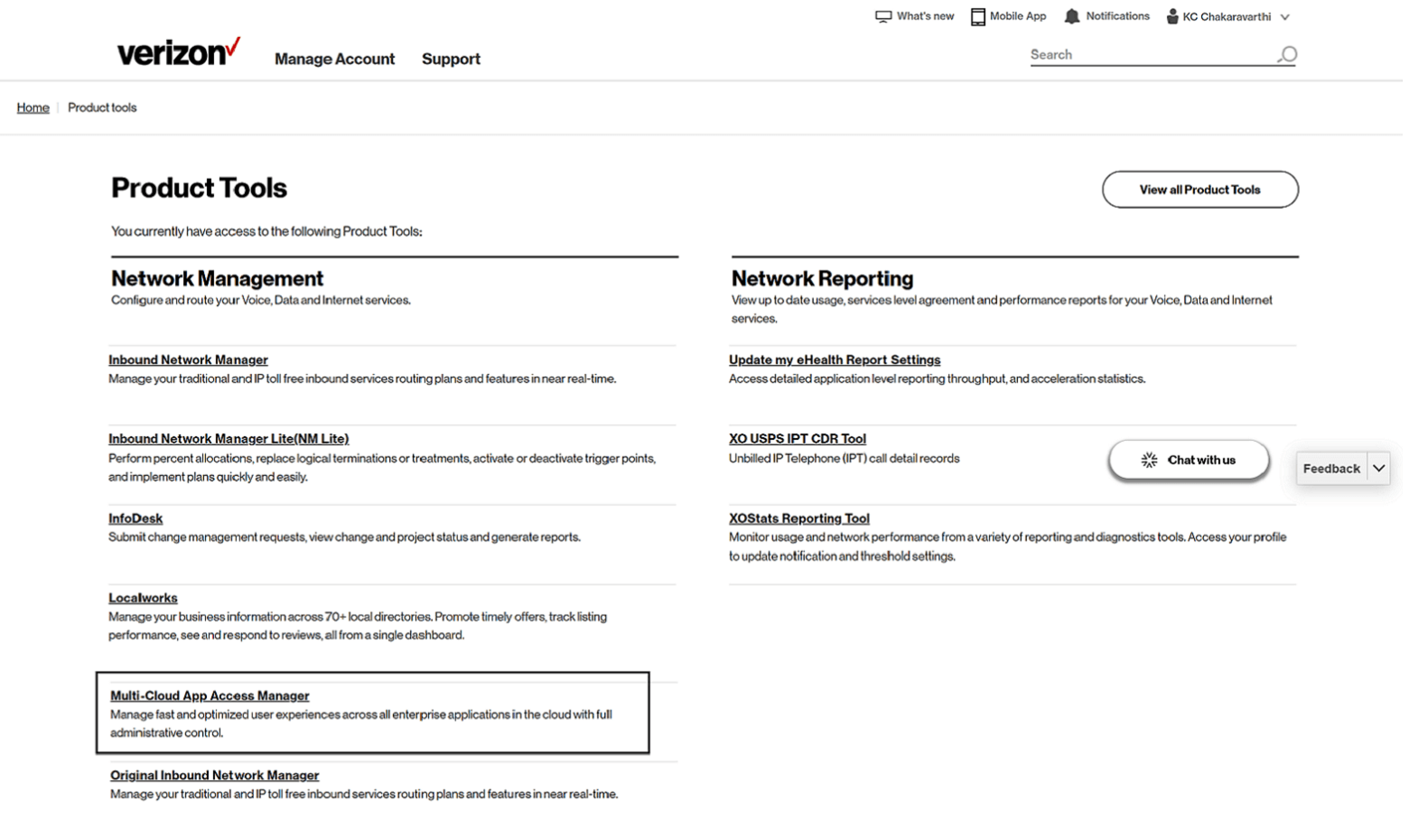 - Click on View All in the Product Tools section. This will display all the product tools you have access to. You will find the Multi-Cloud App Access Manager under the Network Management column.