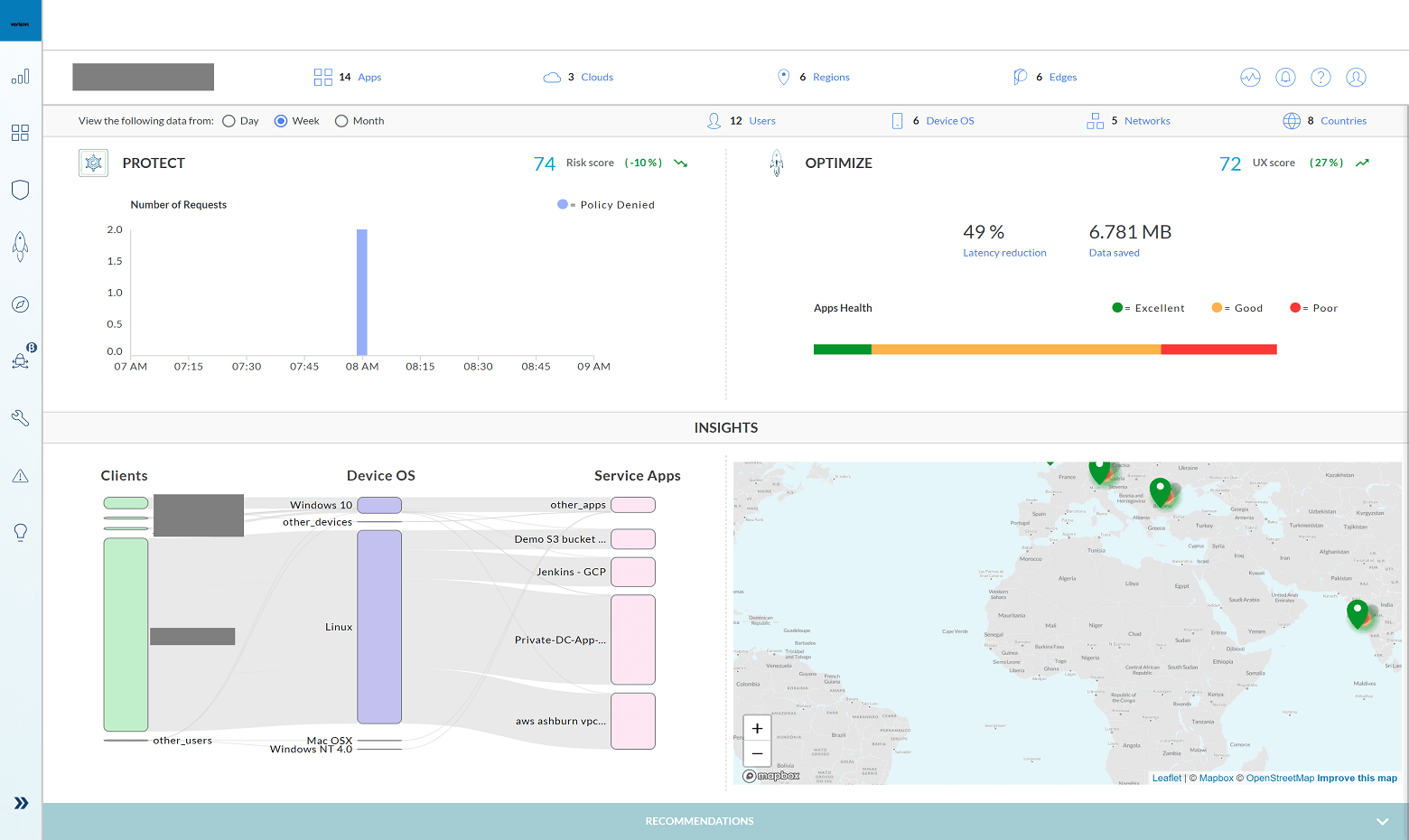 - Gather data from the Multi-Cloud App Access Manager Edges to generate visibility into the session traffic for all users/apps or at a granular level for a single user/app session