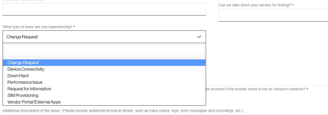 Important Note: In order to initiate a change request for changes that are part of normal On Site 5G support you should open an incident ticket with issue type “Change Request”. You can do that by either calling Verizon Business & Government Customer Operations (800-525-0481 Option #3) or through your Verizon Enterprise Center portal as shown in the below screenshot.